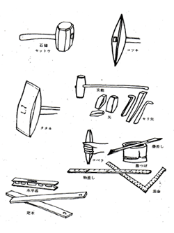 飛鳥時代に作られたと推定される奈良県の酒船石に見える矢穴の跡や、奈良時代に書かれた当麻寺曼荼羅縁記絵に描かれる槌とタガネの使用からでは、石工具の進歩の歴史は江戸時代まで遅々としていたようである。しかし、江戸時代に入ると、石工具は野取り(山石屋)系と石細工(町石屋)系の区別が明瞭になり、山石屋系には切山タガネ(石割りの溝堀り)、ノミ(矢穴堀り)、セット(片手槌)、矢(クサビ)、大ゲンノウ(大槌)などが使用され、町石屋系には細工道具を中心としたソバヨセ(先端が平べったいノミ)、コヤスケ(形を整える)、タタキ(石面を細かくたたく)、ナラシ(細かい突起部をたたく)、ビシャン(面が格子形に隆起した槌)などが用いられた。最後に、これらの道具を使用して像、塔が完成すると、つぎは文字や文様が彫られる。文字彫りの様式は、線彫り(細かい線で彫る)、薬研彫り(深さをV字型に彫る)、竹彫り(底面を竹のようにU字型に彫る)、押彫り(底面を四角形に彫る)などの彫り方があり、この彫り方のみは現代にも活用されてきている。